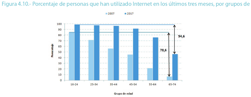 No obstant això, és cert que, segons els estudis de l’Observatori Nacional de les Telecomunicacions i la Societat de la Informació, encara són el grup amb menys percentatge d’ús de les TIC. En totes les competències estudiades (informació, comunicació, resolució de problemes i ús de programari creatiu) les persones més grans de 65 anys estan a la cua de capacitació. Per tant, són la franja-diana més habitual de les accions formatives de capacitació digital. També s’ha de dir que són les que tenen un augment de capacitació més pronunciat en els últims anys (possiblement perquè partien de percentatges molt baixos i tenien més marge de millora). En aquest sentit, l’aparició dels telèfons intel·ligents i la percepció que és important aprendre a fer-los servir té molta influència. De fet, moltes persones grans s’apropen a l’ús de la tecnologia directament a través del mòbil, sense experiència prèvia en l’ús de l’ordinador personal.